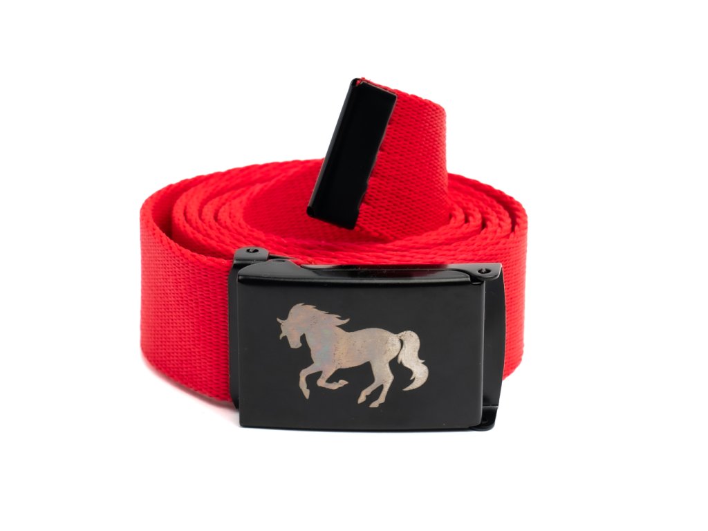 Pás: - materiál: polypropylén - farba: červená - šírka: 30 mm - dĺžka: 115 cm s možnosťou skrátenia podľa potreby Pracka: - rozmer: 5 x 3 cm - materiál: oceľ - farba: čierna + gravír koňa