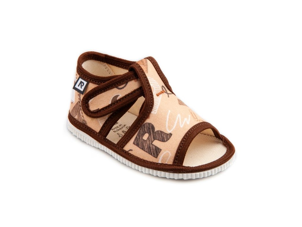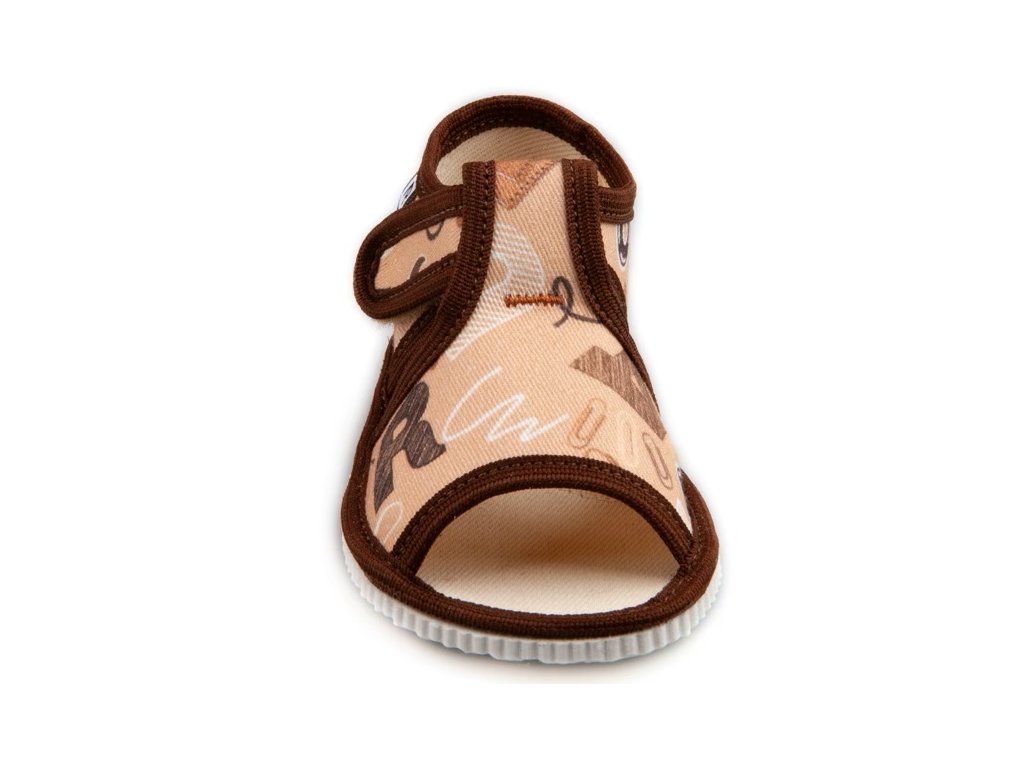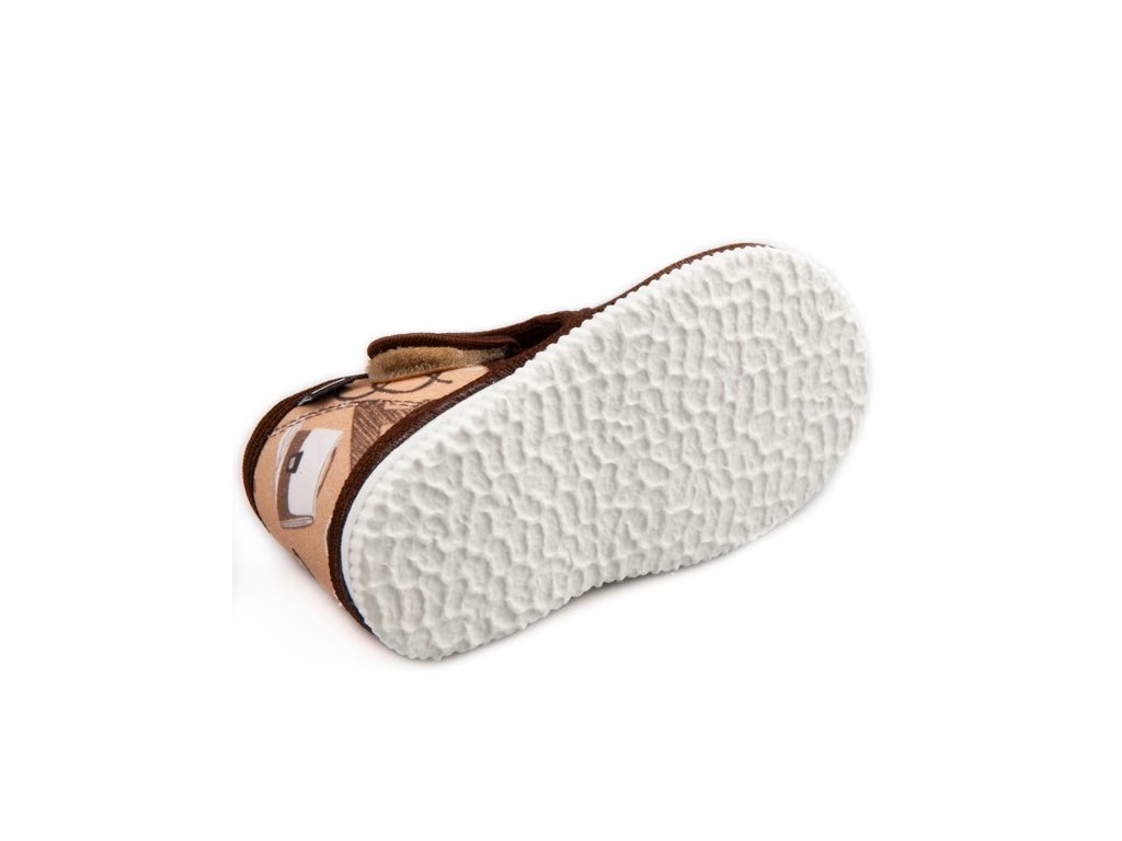 Detské papuče, sandálkového strihu s otvorenou špicou so zapínaním na "suchý zips ". Tvar špičky s dôrazom na typicky detský dominantný palček zabezpečuje dostatočný priestor pre prsty. Papučka je ľahká, pružná vyrobená z textilu ( zo 100% bavlny ), ktorý zabezpečuje priedušnosť a dokonalú prispôsobilosť tvaru nohy. Stielka papučky je v časti klenku vyplnená penovým materiálom, čo zabezpečuje dieťaťu pohodlnú chôdzu a podporuje zdravý vývoj nohy. Papučky sú určené do interiéru ako prezúvková obuv. Majú certifikát o zdravotnej a hygienickej nezávadnosti. Okrem toho boli posudzované komisiou zloženou z ortopéda, detského lekára, modelára a odborníkov na obuv, na základe čoho získali licenciu na používanie ochrannej známky " Žirafa " a " Česká kvalita ".