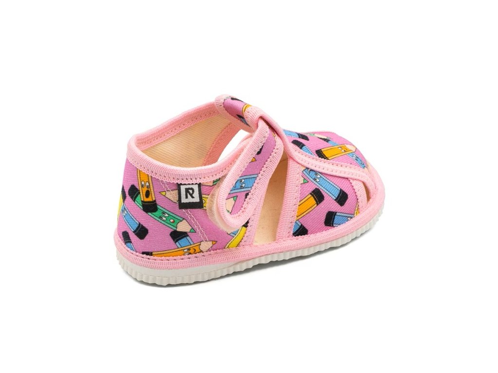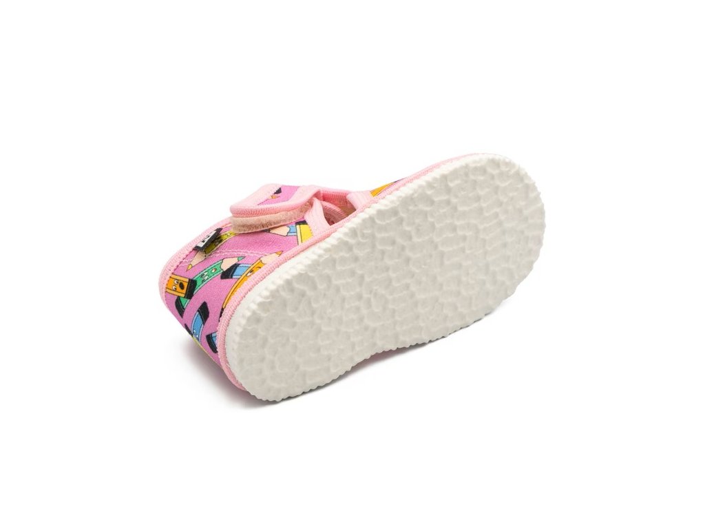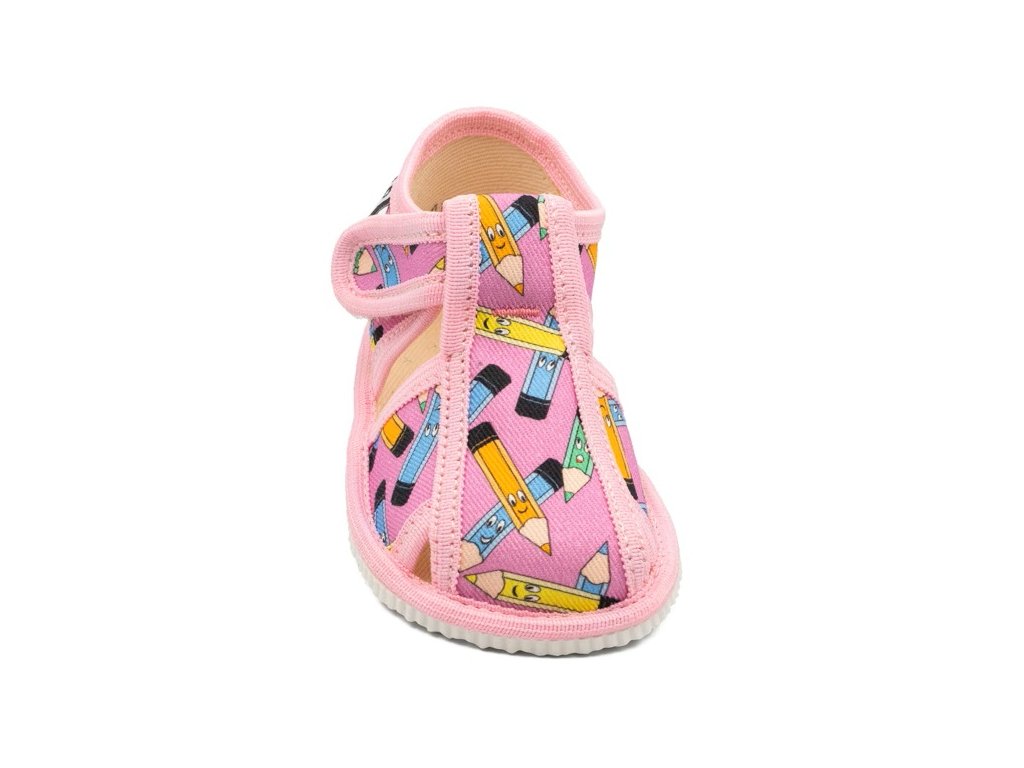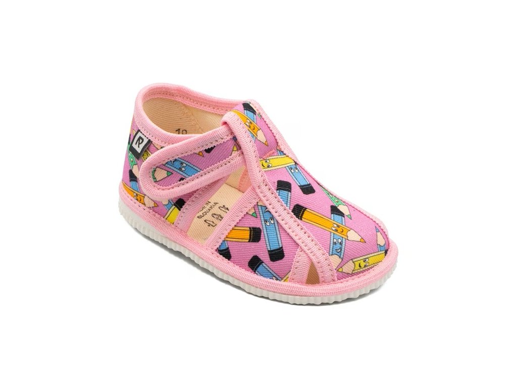 Detské papuče, sandálkového strihu s uzavretou špicou so zapínaním na "suchý zips ". Tvar špičky s dôrazom na typicky detský dominantný palček zabezpečuje dostatočný priestor pre prsty. Papučka je ľahká, pružná vyrobená z textilu ( zo 100% bavlny ), ktorý zabezpečuje priedušnosť a dokonalú prispôsobilosť tvaru nohy. Stielka papučky je v časti klenku vyplnená penovým materiálom, čo zabezpečuje dieťaťu pohodlnú chôdzu a podporuje zdravý vývoj nohy. Obuv je určená do interiéru ako prezúvková obuv. Má certifikát o zdravotnej a hygienickej nezávadnosti. Okrem toho bola posudzovaná komisiou zloženou z ortopéda, detského lekára, modelára a odborníkov na obuv, na základe čoho získala licenciu na používanie ochrannej známky " Žirafa " a " Česká kvalita ".